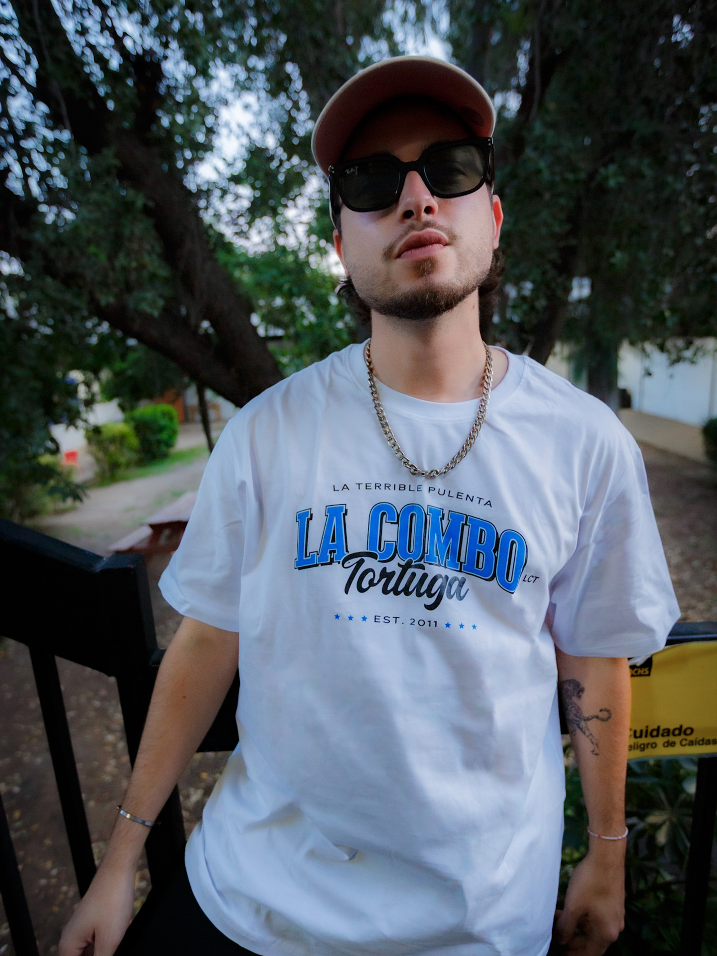 Polera de algodón Blanca, con el logo «La combo Tortuga»