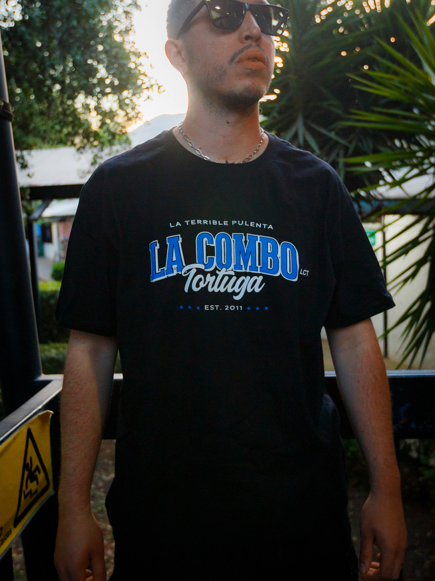 Polera de algodón Negra, con el logo «La combo Tortuga»
